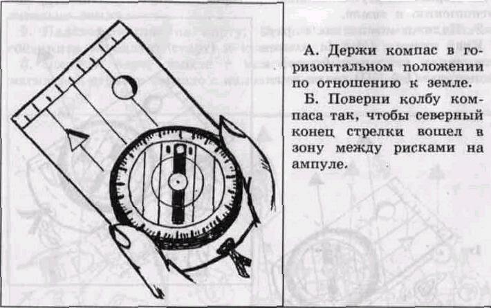Держи компас в горизонтальном положении к земле. Поверни колбу компаса так,